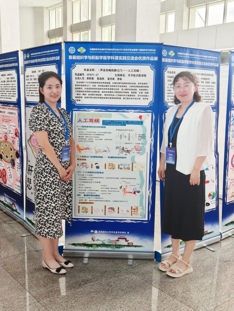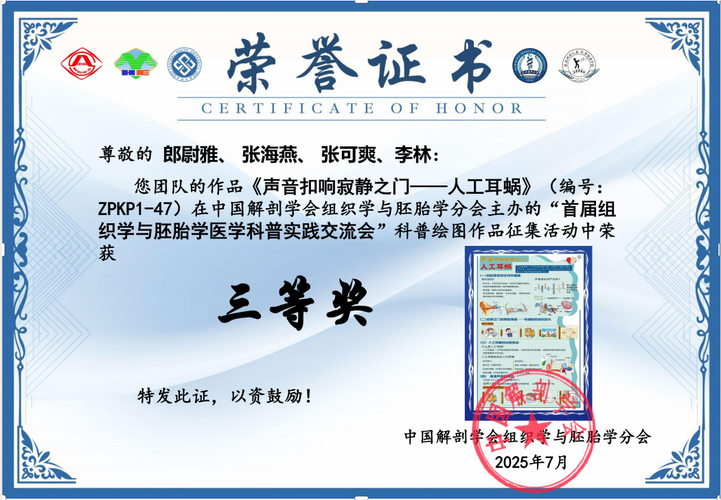 科普实践交流会绽放光彩,师生作品喜获殊荣。中国解剖学会组织学与胚胎学分会主办的“首届组织学与胚胎学医学科普实践交流会”,7月20-23日在湖南长沙中南大学湘雅医学院召开,吸引了全国 23 所高校师生参与。活动征集的科普绘图作品涵盖连环画、海报等多种形式,评审采用“专业评分+分会委员+大众评委”的多元机制,综合考量作品的科学性、艺术性、普及性、原创性及主题契合度。我院教师团队与研究生在此次交流会上均有出色表现:郎尉雅、张海燕、张可爽、李林教师团队的作品《声音叩响寂静之门 —— 人工耳蜗》荣获三等奖,作品不仅系统传递了人工耳蜗与听力健康知识,还巧妙融入健康指导,实现了科普从知识传播到实用价值落地的跨越,为听障相关科普工作贡献了重要力量。