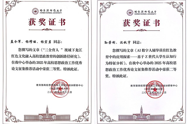 近日,2025年高校思想政治工作优秀论文征集活动结果揭晓,学院2篇论文荣获二等奖。此次活动由教育部高校思想政治工作队伍培训研修中心(哈尔滨师范大学)组织开展,省内外共有87篇论文授奖,其中一等奖15篇、二等奖30篇、三等奖42篇。