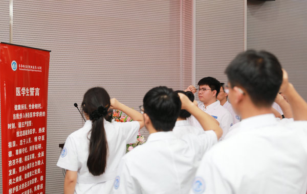 “健康所系,性命相托。当我步入神圣医学学府的时刻,谨庄严宣誓……”全体新生举起右拳,重温医学生誓言。铿锵的誓言回荡在大厅,既是新生对医学事业的承诺,也是师生共同守护的信仰。