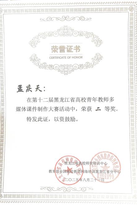 近日,第十二届黑龙江省高校青年教师多媒体课件制作大赛颁奖仪式暨第九期黑龙江省高校教师信息技术应用能力提升专题培训在哈尔滨举行。我院社会工作教研室孟庆天老师的多媒体课件作品荣获二等奖。