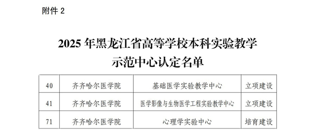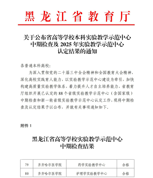 近日,省教育厅发布了《关于公布黑龙江省高等学校本科实验教学示范中心中期检查及2025年实验教学示范中心认定结果的通知》,学院再创佳绩:药学实验教学中心、护理学实验教学中心2个现有省级实验教学示范中心顺利通过中期检查;基础医学实验教学中心、医学影像与生物医学工程实验教学中心被认定为立项建设项目,心理学实验中心被认定为培育建设项目,标志着学院实验教学体系建设迈上新台阶。