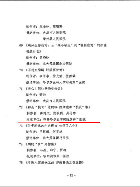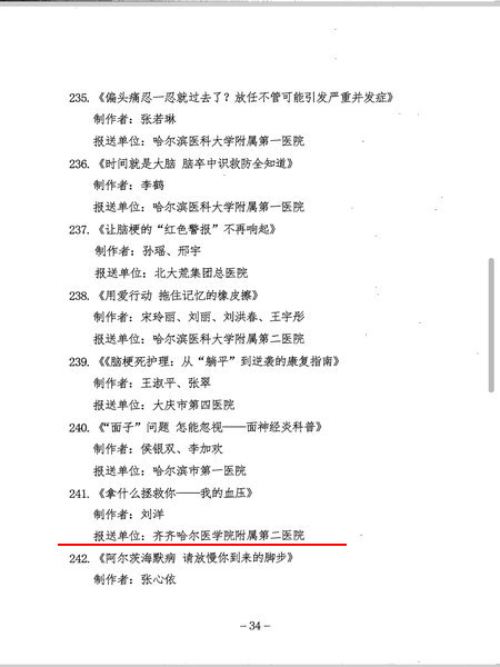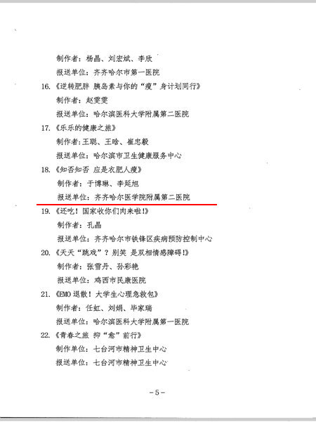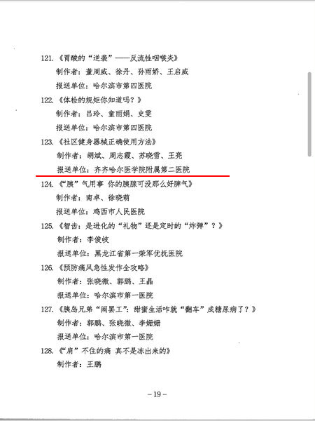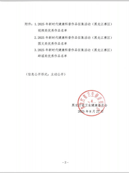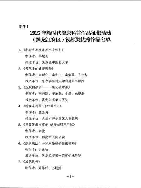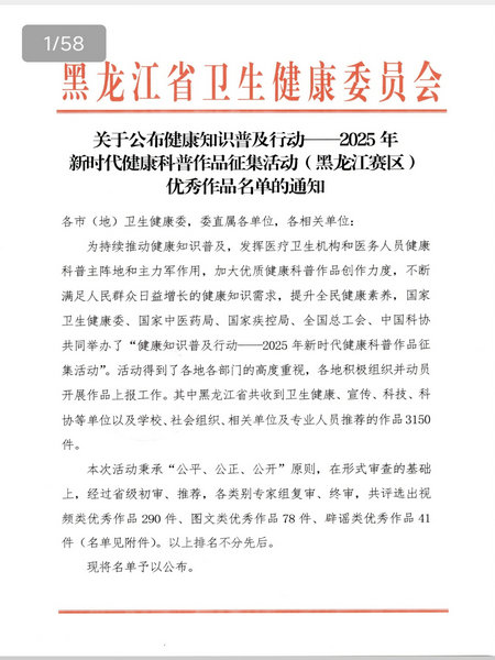 近日,黑龙江省卫生健康委员会公布了“健康知识普及行动——2025年新时代健康科普作品征集活动(黑龙江赛区)”优秀作品名单。齐医附属二院推荐的四部视频类作品获评为优秀作品,充分展现了医院在健康科普创作与传播方面的扎实能力和显著成效。