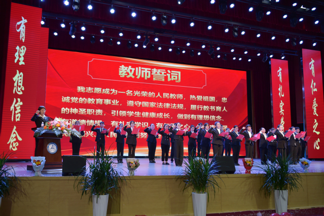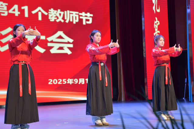 今年的教师节表彰大会新增了行拜师礼环节。在庄重的氛围中,学生代表身着汉服,向现场教师行拜师之礼,铭师恩之重,扬传统文化,践德礼之风。