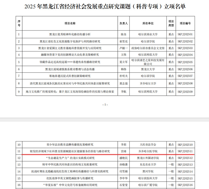 近日,黑龙江省社科联公布了“2025年黑龙江省经济社会发展重点研究课题(科普专项)”立项名单。齐医附属二院宫靖申报的科研项目—《银发经济视阈下社科普及资源赋能社区健康服务的价值与路径研究》成功获批立项,并获批重点项目。