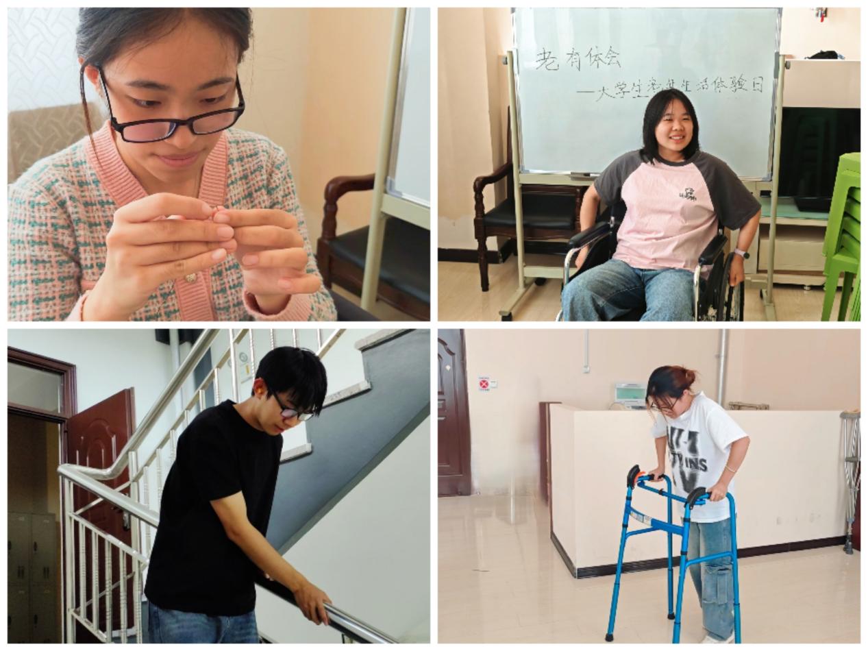 活动现场,同学们穿上负重马甲,模拟关节退化带来的行动不便;戴上模糊眼镜,感受老花眼造成的视力障碍;塞入耳塞,体会听力下降后的沟通难题。随后,在“穿针引线”“上下楼梯”“手机拨号”等日常任务挑战中,学生们深刻体会到了老年人生活中的不易,从“旁观者”变为“参与者”,提升了青年学生自身的社会关怀意识,助力于构建“青年-老年”协同互助的社会支持网络。