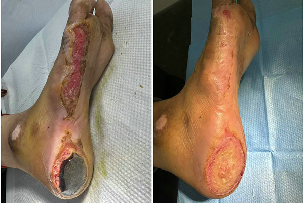 无独有偶,另一位患者因在家中居住土炕足部受压,引起压疮感染,在当地治疗无法缓解,局部感染愈发严重,甚至引起全身的脓毒血症发热。