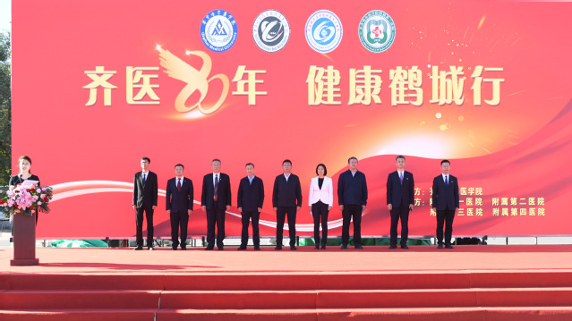 为喜迎学院建校80周年,在国庆、中秋双节即将来临之际,9月28日上午,“齐医八十年 健康鹤城行”服务百姓健康大型义诊活动在市工人文化宫广场启动。学院党委副书记张可勇,市卫健委三级调研员张丽娟,市医疗保障局党组成员、副局长宋志刚,市市场监督管理局党组成员、副局长刘韩出席活动并致辞。学院附属第一、第二、第三、第四医院主要领导出席活动。