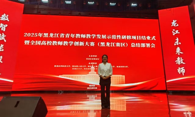 回顾今年4月,由黑龙江省教育厅主办的第五届黑龙江省高校教师教学创新大赛暨第五届全国高校教师教学创新大赛(龙江赛区)在东北林业大学拉开帷幕。作为我院优秀青年教师代表,曹婷老师凭借深厚的教学功底、创新的教学设计和生动的课堂演绎,一路过关斩将,最终荣获一等奖。此次颁奖仪式,正是对她数月前在赛场上优异表现的肯定与嘉奖。