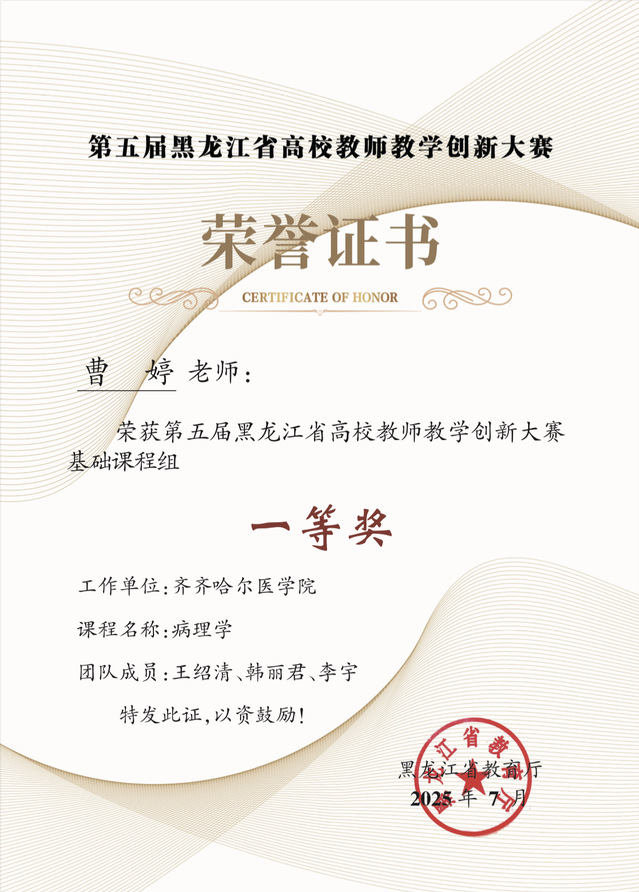 在基础课程赛道的激烈角逐中,曹婷老师以其沉稳大气的教姿教态、逻辑严密的教学思路、富有启迪性的互动设计,充分展现了当代青年教师扎实的专业素养和锐意创新的教学精神。她的课堂不仅知识传授精准高效,更融入了对病理学科教育事业的赤诚与热爱,体现了一名优秀青年教师应有的理想信念与责任担当。这份荣誉的背后,是她对教学艺术的执着追求,对学生成长的深切关怀,更是齐齐哈尔医学院、病理学院长期以来重视教学改革、鼓励青年教师成长的丰硕成果。