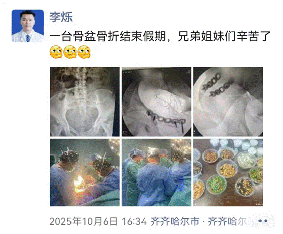 “一台骨盆骨折结束假期,兄弟姐妹们辛苦了。”10月6日,中秋佳节,当大多数人沉浸在阖家团圆的温馨中时,齐医附属二院骨外科四病区副主任、主诊医疗组组长李烁在朋友圈写下了这样一句话。这条配有多张手术室照片和凉透盒装炒菜外卖的状态,瞬间收获了无数点赞与敬意,也揭开了节日里一个关于生命坚守的感人故事。