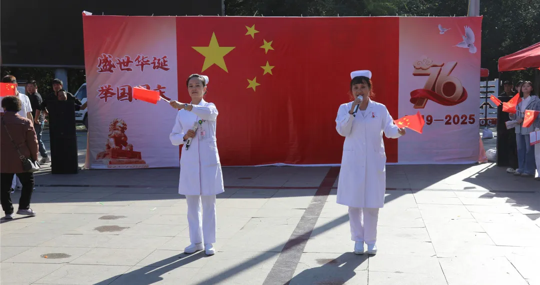 30日上午9点,一段悠扬的音乐在红岸公园上空响起,义诊人群中,我院医护人员暂时放下手中的工作,拿起麦克风,随着音乐唱起了《今天是你的生日中国》《我和我的祖国》《歌唱祖国》,歌声宛转悠扬,朗诵铿锵激昂,现场的医护人员和前来义诊的百姓受到现场热烈气氛的感染,都不约而同地跟着大声唱起来,歌声响彻云霄。不少市民一边跟着哼唱,一边拿出手机记录下这动人的瞬间,大家手中挥舞的五星红旗与脸上的笑容相映成辉,成为红岸公园当天最美丽的风景线。