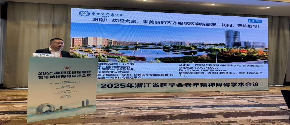 10月10-12日,由浙江省医学会老年精神障碍分会主办的“浙江省医学会老年精神障碍学术会议”在湖州召开,大会聚焦老年精神障碍领域的最新研究进展和临床实践创新开展交流。齐齐哈尔医学院精神卫生学院副院长孙正海副教授受邀在本次年会上做专题报告。