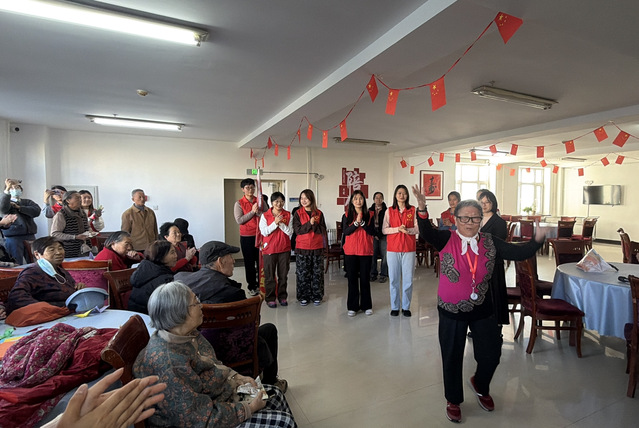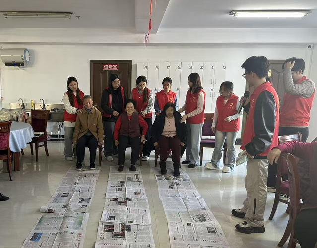 “报纸跑酷”游戏则为现场增添了欢声笑语。老人们在志愿者的搀扶与引导下,踩着报纸“赛道”稳步前行,在轻松的运动中释放活力,现场掌声与笑声不断。而红歌传唱环节,更是将活动氛围推向高潮。志愿者牵头唱响《团结就是力量》《社会主义好》等经典歌曲时,78岁的张奶奶主动起身,带领大家调整节奏、把握音调。当唱到“共产党辛劳为民族,共产党他一心救中国”时,她声音洪亮,眼神坚定;演唱《社会主义好》时,她特意提高声调,神情中满是自豪,其他老人也纷纷加重语气,歌声愈发铿锵有力。不少老人眼泛泪光,现场氛围感人至深。演唱结束后,张奶奶还郑重嘱托志愿者:“建设社会主义强国就靠你们啦!”殷切的话语与红歌余韵交织,成为现场最动人的风景。