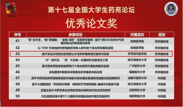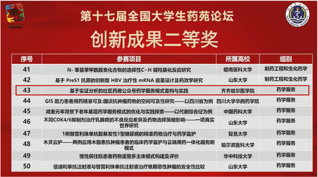 “药苑论坛”是全国高等教育药学类顶级赛事。在决赛中,我院学子表现优异,再创佳绩。其中,由袁晓安老师指导的项目《基于实证分析的社区药房公众号药学服务模式重构与实践》荣获药学服务赛道“创新成果二等奖”与“优秀论文奖”;朱文全老师指导的项目《低密度脂蛋白修饰介孔碳靶向递药系统的构建及抗肝癌研究》荣获药学科学赛道“创新成果三等奖”及“优秀壁报奖”;王文豹老师指导的项目《靶向线粒体的薯蓣皂苷元衍生物的设计、合成及抗肿瘤活性研究》荣获药学科学赛道“创新成果三等奖”;宋娟老师指导的项目《tNGS 助力的肺炎精准诊疗中的药学服务实践》荣获药学服务赛道“创新成果三等奖”。这些成绩的取得,充分体现了我院在药学科学和药学服务领域人才培养方面的扎实积累与实践成效。