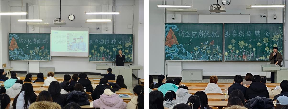 为深化“访企拓岗促就业”专项行动成果,精准对接用人单位需求,助力 2026届毕业生深度了解用人单位需求、明晰职业发展路径,从而高质量就业。10月18日以“齐齐哈尔医学院2026届毕业生秋季大型校园招聘会”为依托,护理学院举办了“宏观招聘+精准解读”的专场招聘宣讲会,通过用人单位的讲解,有效提升就业服务的针对性与实效性。