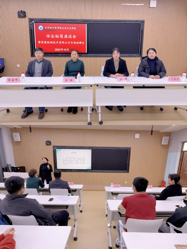 为深入贯彻落实高校毕业生就业工作部署,搭建用人单位与毕业生精准对接的就业桥梁,10月31日下午2:00,公共卫生学院在部系楼AB101教室成功举办访企拓岗座谈会暨影康检测技术有限公司专场招聘会。本次招聘会由学院精心组织,旨在为2026届毕业生提供优质就业岗位,同时为各年级学生搭建了解行业动态、明确职业方向的实践平台。