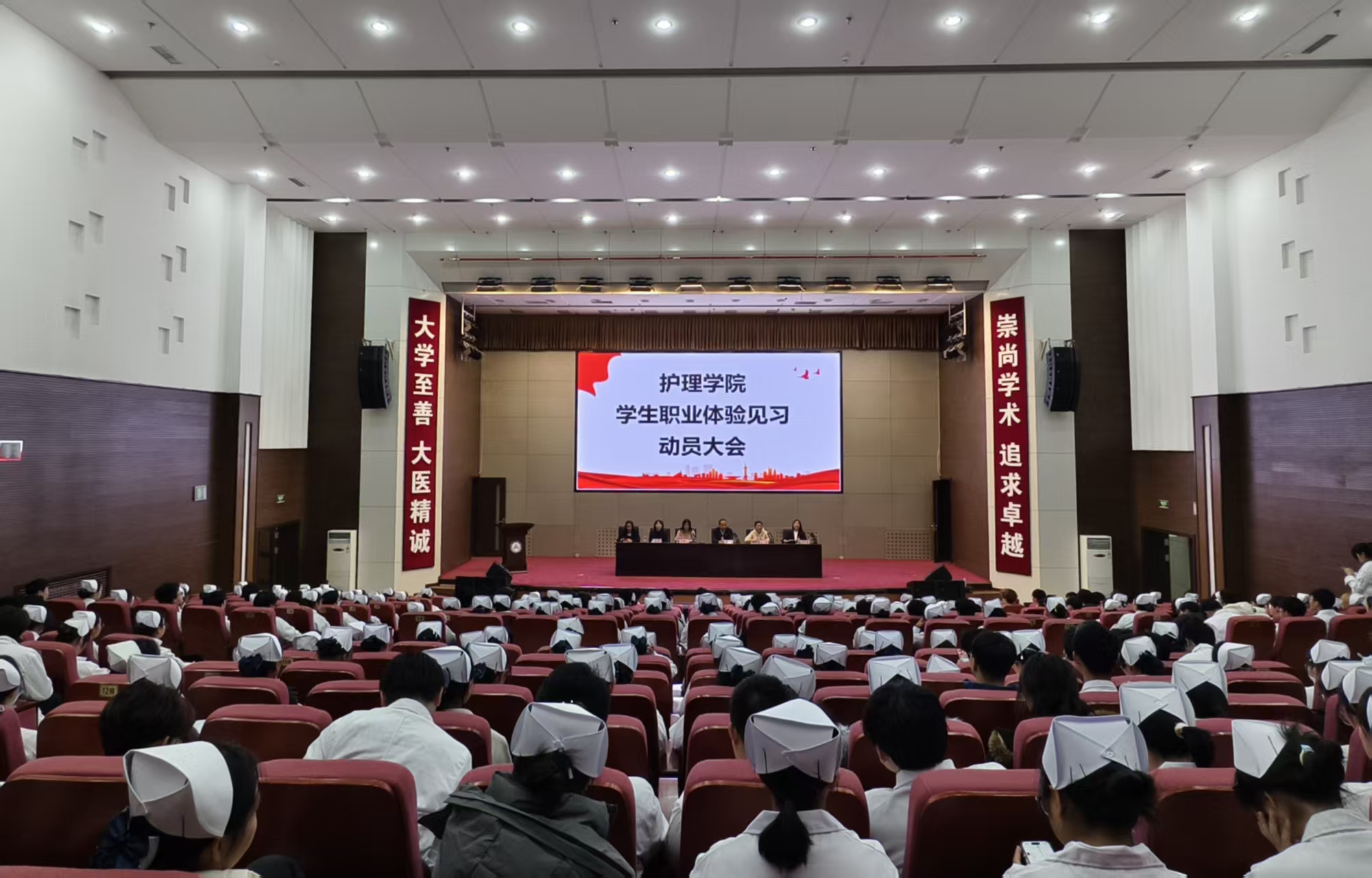 11月5日下午,护理学院在图书行政楼二楼多功能厅召开2025级学生职业体验见习动员大会。护理学院领导班子、学工办主任、教务科科长、2025级辅导员及全体新生300余人参加会议。会议由副院长马秀梅主持。