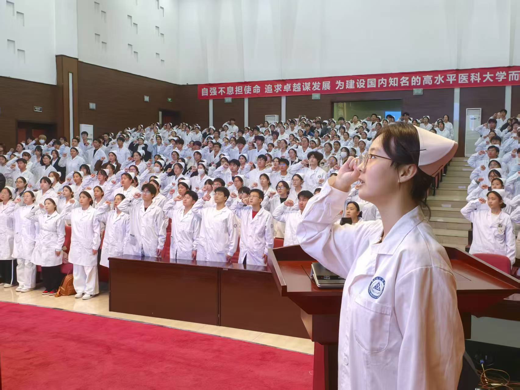 会上,高音院长就学院的历史沿革、校园文化、师资队伍建设等整体情况进行介绍,李桂玲副院长阐述了护理硕士专业学位授权点的基本情况,马秀梅副院长对专业培养方案进行了详细解读,王坤主任针对职业体验见习过程中的安全问题进行了强调,唐美玲科长对职业体验见习提出明确要求,领导和老师们一致希望学生能牢记安全准则、严守见习规范,以谦逊务实的态度投入实践,虚心向行业前辈请教,注重理论与实践结合,认真记录见习心得,在实操中提升专业素养与岗位适配能力,确保见习活动有序有效开展;2024级护理学专业田梦同学带领全体新生进行南丁格尔誓言宣誓;2025级护理学专业周佳慧同学代表全体新生发言,表达了对投身护理实践的热忱与决心,并郑重承诺一定尽最大努力圆满完成职业体验见习任务。