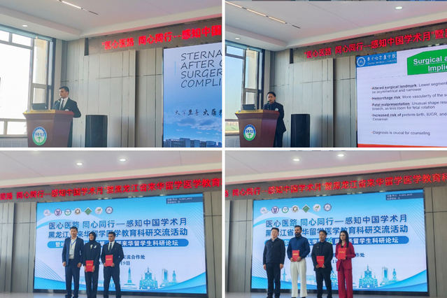 学术论坛设科研报告与病例分析两个专场,学院巴基斯坦籍留学生QADEER ABDUL和尼泊尔籍留学生ROKA DIL SAHI分别以《开胸手术后胸骨伤口感染:一种可预防的并发症》《意外发现:初产妇紧急剖宫产术中偶然诊断出双子宫》为题,分享临床观察与思考,赢得现场评委与中外师生热烈掌声,分别荣获案例分析二等奖、三等奖。