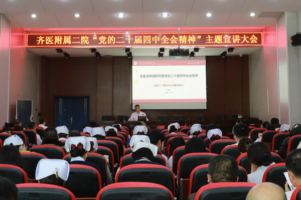 11月13日下午,根据学院党委统一部署,为深入传达学习党的二十届四中全会精神,齐医附属二院在临床技能中心多功能厅召开党的二十届四中全会精神主题宣讲会,党委书记刘增良同志作主题宣讲,院长、党委副书记武立刚同志等党委班子及全院中层干部认真聆听了宣讲。