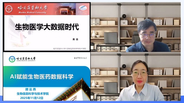 随后,顾云燕教授带来《AI赋能生物医药数据科学》的精彩分享。她不仅分享了哈尔滨医科大学生物信息学专业的办学历程和学科特点,同时对我校建设生物医药数据科学专业提出建议。在科研分享中她聚焦人工智能技术与生物医药数据的融合应用,通过具体案例详解了机器学习、深度学习等技术在基因序列分析、药物靶点发现等方面的突破。顾教授用通俗易懂的语言拆解复杂技术原理,让在场师生对AI如何破解生物医药数据处理难题有了清晰认知,其生动的讲解多次引发现场掌声。