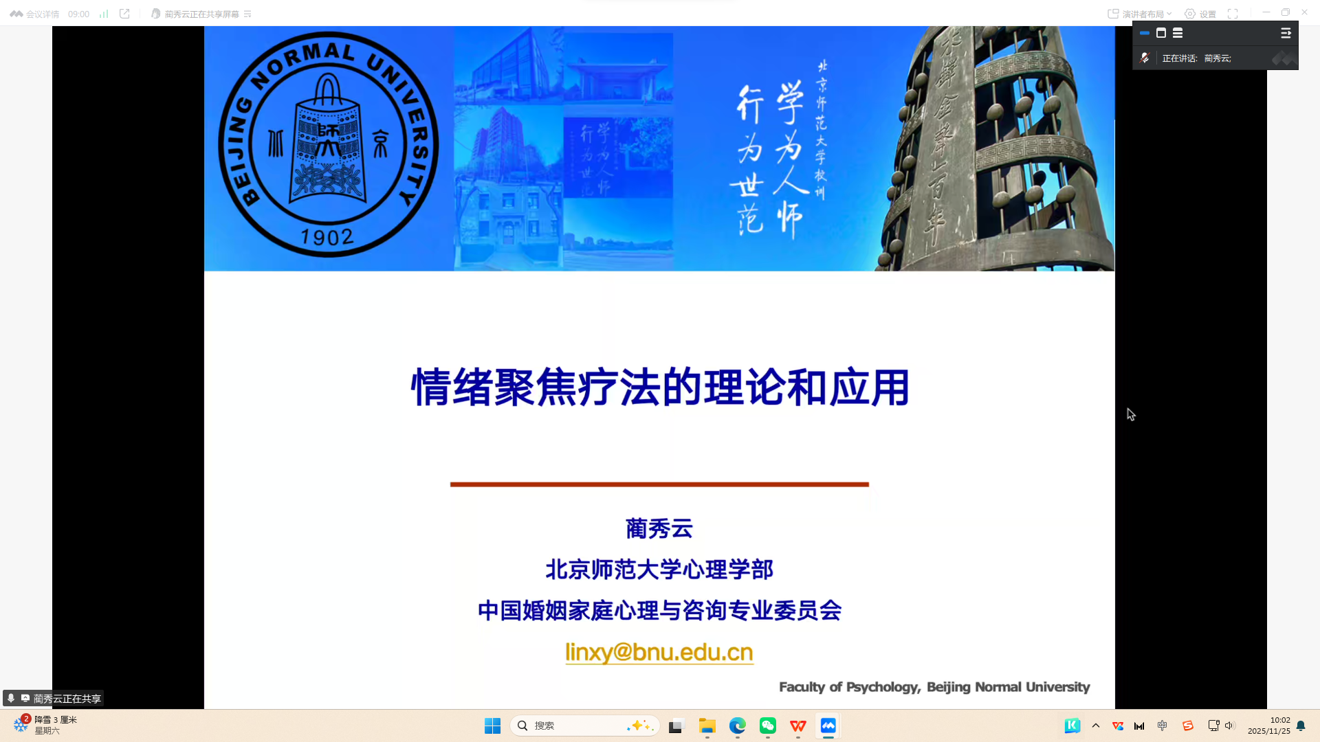 11月25日,精神卫生学院邀请北京师范大学蔺秀云教授举办了主题为《情绪聚焦疗法的理论和应用》线上专题讲座。学院全体教师、应用心理学专业研究生参加。副院长李成冲主持讲座。