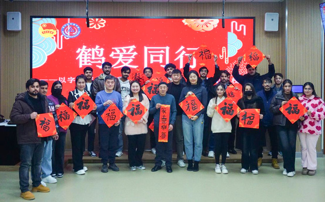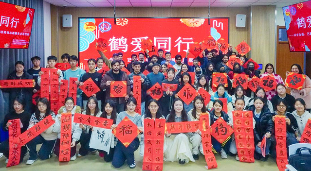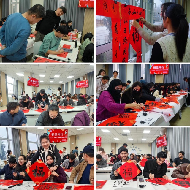 11月26日下午,学院的书法教室里墨香氤氲。市书协主席崔武卿、副主席王义,建华区书协主席王跃进及省书协会员劳万军等正手把手指导留学生们书写 “福” 字。当天,学生社团书法协会联合市书法家协会举办的“鹤爱同行——以字会面 艺脉相承”书法培训志愿服务活动如期开展,中外学子以笔为媒,在笔墨流转间感受中华传统文化的深厚底蕴。