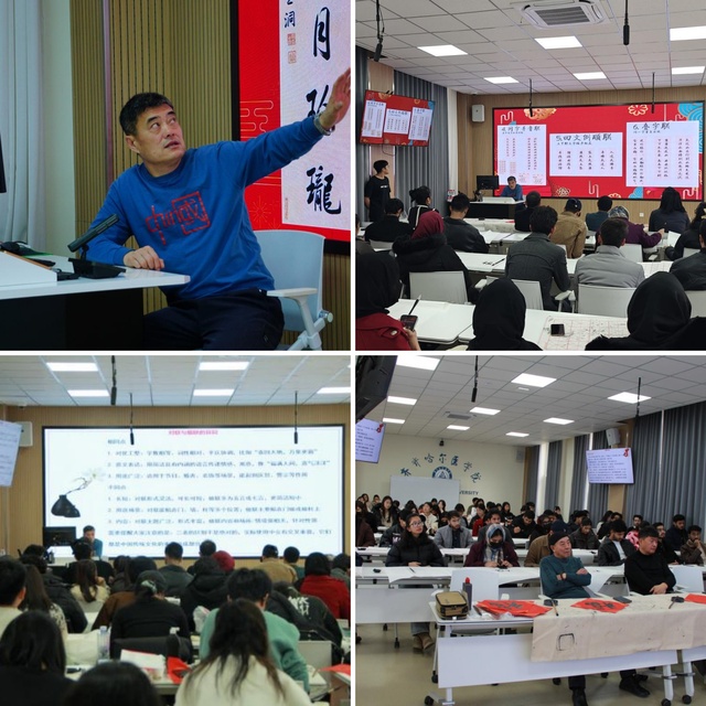 本次活动特邀书法名家莅临指导,吸引了学院中国学生与来自多个国家的留学生共同参与。作为活动主讲人,崔武卿主席以“楹联文化”为切入点,从周代桃符的起源讲到现代对联的应用,从平仄对仗的格律讲到词性相对的技巧,结合“一元复始,万象更新”“春风得意马蹄疾,一日看尽长安花”等经典楹联案例,生动诠释了中华文字艺术的博大精深。“楹联不仅是一种文学形式,更是中国人情感表达的载体,藏着节气、民俗与人生智慧。”崔武卿的讲解深入浅出,让在场学子对书法背后的文化内涵有了更深刻的理解。