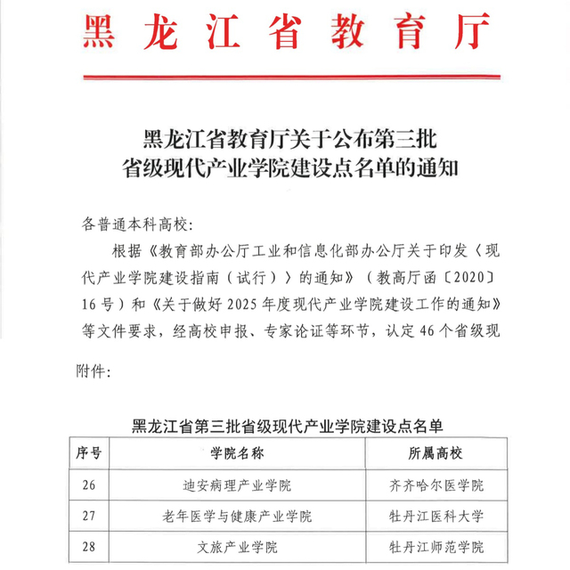 近日,黑龙江省教育厅正式公布第三批省级现代产业学院建设点名单,学院“迪安病理产业学院”成功入选。此次省级认定是学院深化医教协同、推进产教融合的突破性进展,标志着学院在应用型医学人才培养与服务龙江医药健康产业发展方面迈上新台阶。