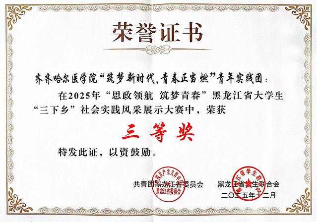 12月4日,由团省委、省学联联合主办的2025年“思政领航 筑梦青春”黑龙江省大学生“三下乡”社会实践风采展示大赛圆满收官。病理学院“筑梦新时代,青春正当燃”青年实践团凭借扎根基层的扎实实践与专业赋能的创新举措,在全省69所高校、4万余名师生组建的8000余支参赛团队中脱颖而出,荣获大赛三等奖,用青春实绩彰显齐医学子“以专业服务民生、以行动助力振兴”的时代担当,为学校实践育人工作再添亮色。