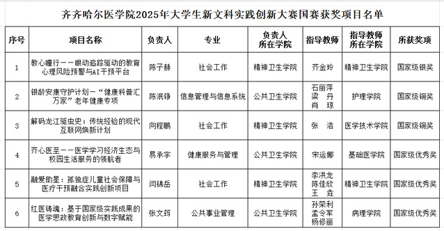 本届赛事自启动以来,得到学院领导的高度重视与各二级单位的大力支持,共吸引了68个项目、566人次参与,热度创下新高。经专家严格评审、择优遴选,学院推荐20个项目晋级省赛,获得了省赛3金7银8铜的优异成绩,并有6个优秀项目成功晋级国赛。其中,精神卫生学院齐金玲老师指导的陈子赫的《教心瞳行——眼动追踪驱动的教育心理风险预警与AI干预平台》项目挺进全国总决赛现场路演,与国内多所顶尖高校学子同台竞技并荣获银奖。