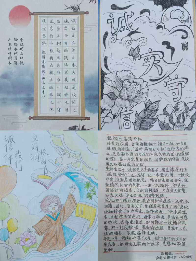 在强化纪律教育的同时,学院注重以文化人,同步开展了“诚信”主题的征文、书法、绘画作品征集活动,学子们纷纷用文字、翰墨、画笔表达对诚信的思考、感悟和对诚信价值的理解。一批主题鲜明、形式多样的艺术作品涌现,让诚信教育跳出单一说教模式,在艺术欣赏与情感共鸣中浸润学生心田,实现思想性、艺术性与教育性的有机统一。