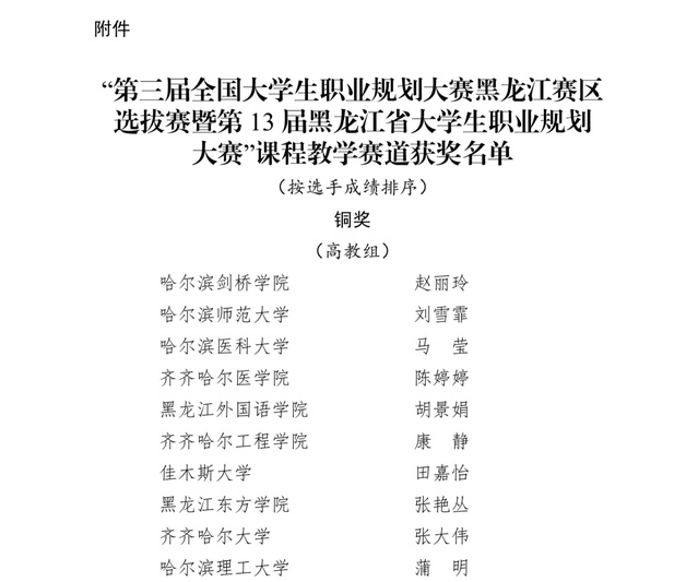 近日,由黑龙江省教育厅主办的“第三届全国大学生职业规划大赛黑龙江赛区选拔赛暨第13届黑龙江省大学生职业规划大赛课程教学赛道”省级决赛圆满落幕。经过激烈角逐,学院《职业发展与就业指导》课程教师陈婷婷获高教组铜奖,再创佳绩。