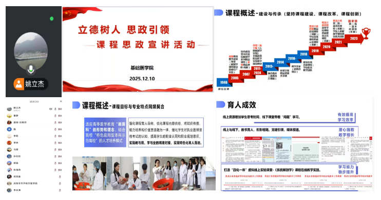 为深入贯彻《齐齐哈尔医学院课程思政示范课程建设管理办法(试行)》(院政发〔2024〕77号)文件精神,推进“三全育人”教学改革,充分发挥省级课程思政教学成果的示范引领作用,12月10日,基础医学院在腾讯会议平台组织了一场意义非凡的课程思政宣讲活动。此次活动吸引了20位对课程思政建设满怀热忱的教师参与,大家齐聚线上,共同探寻课程思政的新路径、新方法。