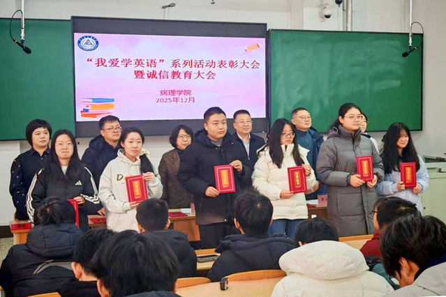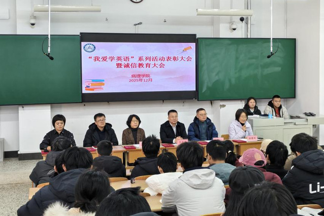 大会对在“我爱学英语”系列活动中表现优异的学子予以公开表彰,现场为获奖学生颁发荣誉证书,以榜样力量激发全体学生的学习热情。于海涛与病理学院领导一起为获奖学子送上祝贺,鼓励他们珍惜荣誉、再接再厉。大会还从诚信做人、诚信治学、诚信应考三大维度,开展了诚信专题教育,引导学生自觉抵制学术不端与考试作弊行为。