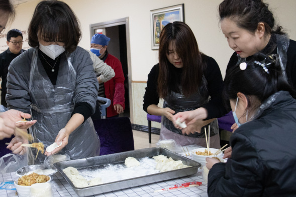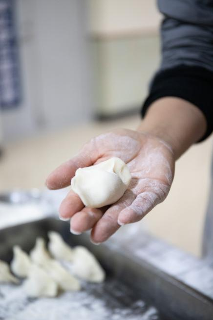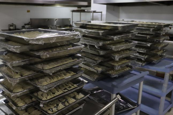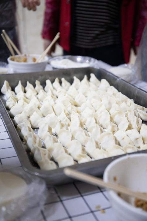 食堂里,大家围坐在一起,共享热腾腾的饺子,温馨洋溢。