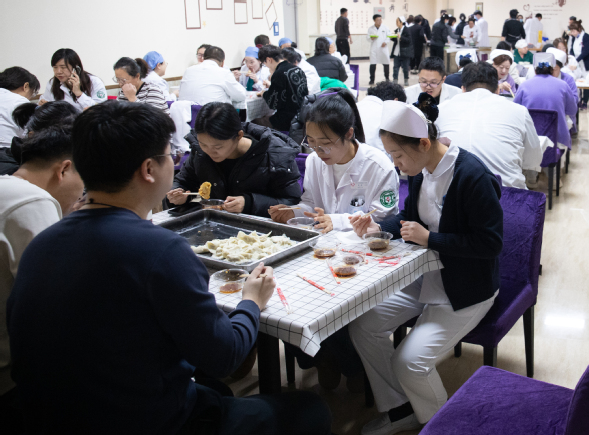 党员们手下包出的每一个饺子,都包裹着真挚的情谊与温暖的祝福。这边,刚刚包好的饺子陆续下锅,诱人的香气飘散在食堂的各个角落,吸引了下班的职工陆续前来。大家围坐在一起,品尝美味的同时,也交流着工作与生活,情谊在热气中升华。另一边,打包整齐的饺子被细心装好,由党员代表分批送往手术室、急诊科、检验科等值班岗位,让那些因忙碌无法离开岗位的同事,也能品尝到节日的味道,感受到来自集体沉甸甸的关怀。这份跨越科室的惦念,让坚守岗位的他们,收获的不仅是食物的温暖,更是医院大家庭深深的归属感。