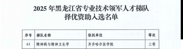 近日,省人力资源和社会保障厅印发《关于公布2025年黑龙江省专业技术领军人才梯队择优资助入选名单的通知》,从全省384个省级领军人才梯队中遴选了74个梯队予以资助,学院精神病与精神卫生学领军人才梯队成功获批2025年省级领军人才梯队择优资助。