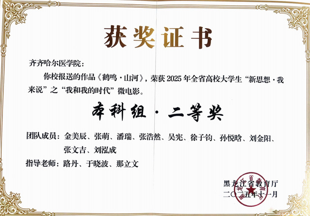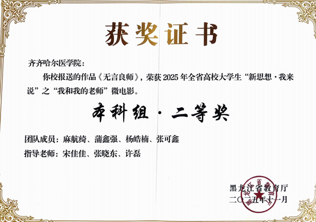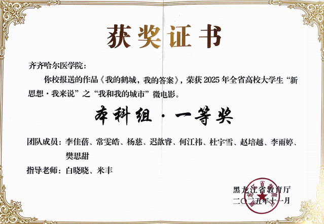 黑龙江省高校大学生“新思想·我来说”主题展示活动是由黑龙江省教育厅主办的思想政治教育领域的专门竞赛。本次竞赛分为“我和我的城市”“我和我的老师”“我和我的时代”三个类别,以团队形式参加。马克思主义学院按照活动通知要求,积极动员各学科思政课教师和广大学生广泛参与,经过精心筹备,最终上报了四个作品并全部获奖。其中,白晓晓老师指导的学生作品《我的鹤城 我的答案》荣获“新思想·我来说”之“我和我的城市”微电影一等奖、宋佳佳老师指导的学生作品《无言良师》荣获“新思想·我来说”之“我和我的老师”微电影二等奖、路丹老师指导的学生作品《鹤鸣·山河》荣获“新思想·我来说”之“我和我的时代”微电影二等奖、杜越老师指导的学生作品《向下扎根,向上生长》荣获“新思想·我来说”之“我和我的时代”微电影三等奖。