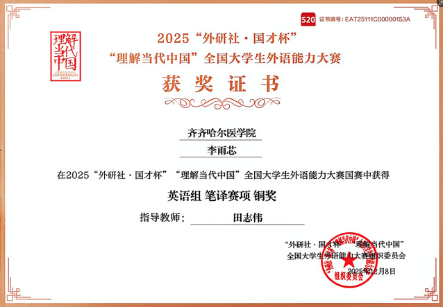 近日,2025年“外研社·国才杯”“理解当代中国”全国大学生外语能力大赛全国总决赛在北京落幕。学院2024级精神医学专业李雨芯同学凭借扎实的语言功底与出色的跨文化沟通能力,在英语组笔译赛道中,位列全国前十,斩获铜奖,实现了学院在该项赛事上的新突破。