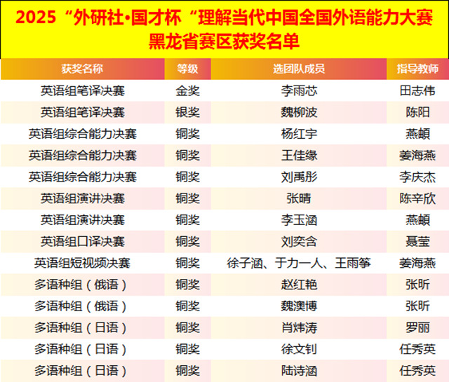 “外研社·国才杯”“理解当代中国”全国大学生外语能力大赛是教育部高等教育司重点组织的A类外语赛事,以“理解中国,沟通世界”为主题,设英语、多语种和国际中文三大组别。国赛由北京外国语大学主办、外语教学与研究出版社承办,省赛由黑龙江省委宣传部和黑龙江省教育厅联合举办。采用“校赛—省赛—国赛”三级选拔机制,共吸引1537所高校的72.6万人次参赛。