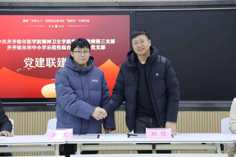 为深入落实高校“双带头人”教师党支部书记“强国行”专项行动相关要求,不断增进党支部之间的交流与合作,12月24日下午,齐齐哈尔市中小学示范性综合实践基地党支部书记刘佳、副书记李娜带领全体党员莅临我校开展“强国行”共建活动暨支部结对共建协议签约仪式。学院党总支书记杨泰、副院长孙正海以及教师第三党支部全体党员共同参加。