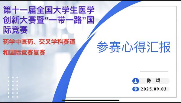 9月3日,药学院举办学科竞赛交流分享会,药学院陈颂教授于6月16日收到十一届全国大学生医学创新大赛暨“一带一路”国际竞赛组委会的正式邀请,作为赛事评审专家,陈颂教授全程参与评审工作,见证了当代大学生在医学创新领域的活力与担当。此次分享会由药学院崔红霞副院长主持,药学院全体教师参会。