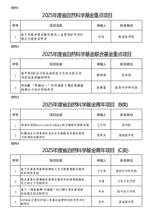 本次立项覆盖重点项目、联合基金重点项目、青年项目B类、C类等多个类别,立项结构均衡优化,科研力量梯次搭配、接续发力。其中,林岩教授主持的“基于多组学整合解析黄芪心血管保护作用机制及功能食品研发”成功获批省重点项目;韩翠艳教授主持的“葫芦素B防治卡培他滨所致手足综合征及协同抗结直肠癌的研究”、蔡德富研究员主持的“胡桃醌‘药辅合一’协同铜离子增效胰腺癌的超分子纳米药物研究”获批省联合基金重点项目,将为相关疾病防治及健康食品产业发展提供重要理论支撑与技术路径。