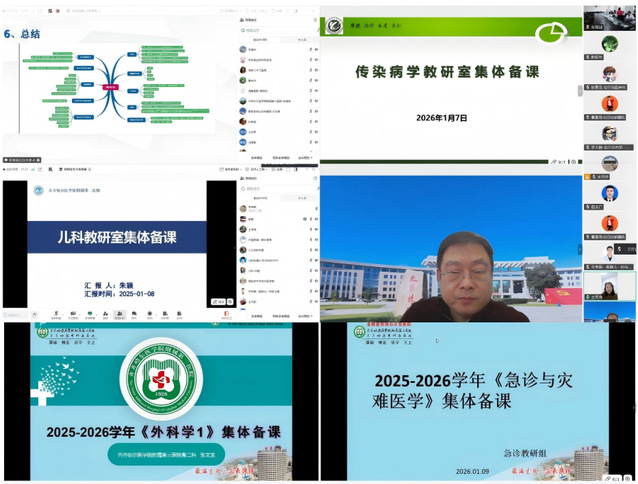集体备课是凝聚教学智慧、规范教学流程的关键环节,旨在通过协同研讨统一教学大纲、明确教学目标、优化教学设计、严格过程管理和考核方案,确保每一位学生都能接受到高质量的教育。本次集体备课活动覆盖《内科学1》《传染病学》《儿科学》《外科手术学》《外科学1》《急诊与灾难医学》6门临床核心课程,实现了多学科、多学段教学资源的深度共享与协同优化。各主备单位围绕课程重难点解析、教学案例设计、课程思政融入、执考失分点分析等核心内容,进行了细致深入的分享与研讨;授课教师结合教学实践经验,分享了鲜活的教学实例与实用教学技巧,为课程内容注入新活力。线上实时交流通道同步畅通,跨校区、跨学院的教师积极参与互动、建言献策。资深教师充分发挥“传帮带”作用,倾囊相授教学心得与宝贵经验,青年教师带来创新教学思路与方法,形成了“老带新、新促老”的良好研讨氛围。