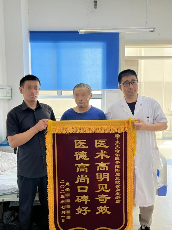 2025年,我院神经外二科副主任医师徐加志奔赴大兴安岭地区人民医院开展为期近半年的援边医疗工作。期间,他凭借扎实的专业功底和丰富的临床经验,全力投身当地神经外科诊疗能力建设,开展脑出血脑疝、脑外伤、脑积水、PeeK材料修补术、脑肿瘤等手术20余例,交出了一份亮眼的援边答卷,不仅得到当地医院一致好评,也为两院搭建起深厚的医疗协作桥梁。大兴安岭地区医疗资源相对薄弱,曾有一位退休的林业工人在当地医院检查出患有左侧额叶巨大脑膜瘤,严重影响正常生活甚至危及生命。考虑到手术风险等多方面因素,患者慕名来到大兴安岭地区人民医院找到我院援边医生徐加志。他与大兴安岭地区人民医院专家深入分析讨论,制定精密手术方案,最终在完整切除肿瘤的同时,也切除了侵犯的硬脑膜。患者术后15天顺利出院,出院前,患者及家属为徐加志送来锦旗,并表示:“徐医生不仅解决了我们的病痛,更让我们感受到了温暖,真心感谢您的悉心救治。”