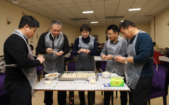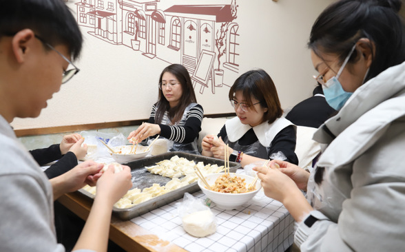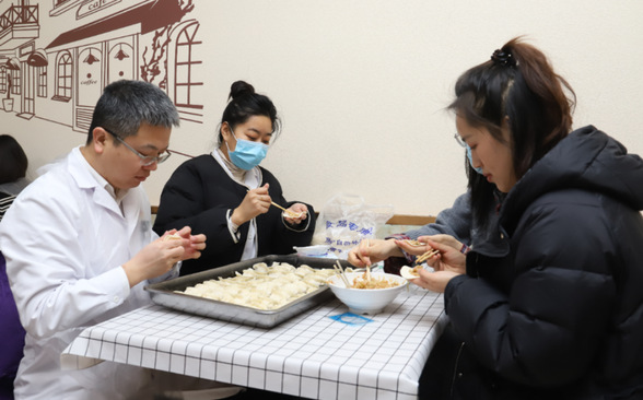 后勤服务工人们围坐一起,共享热气腾腾的饺子