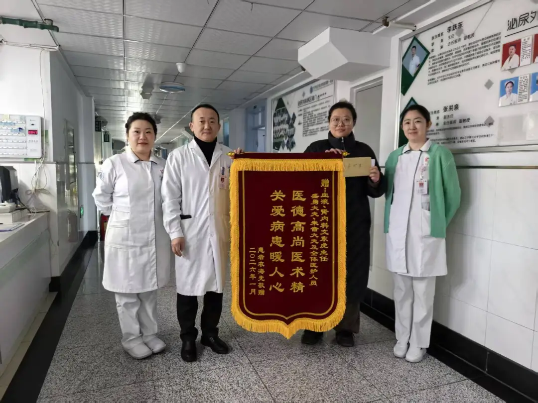 近日,齐医附属一院血液肾内科收到了一份满载真情的感谢——患者衣海光的家属将一面印有“医德高尚医术精,关爱病患暖人心”的锦旗送到医护人员手中,并亲笔写下感谢信,向多科室协作救治的医护团队致以最诚挚的谢意。