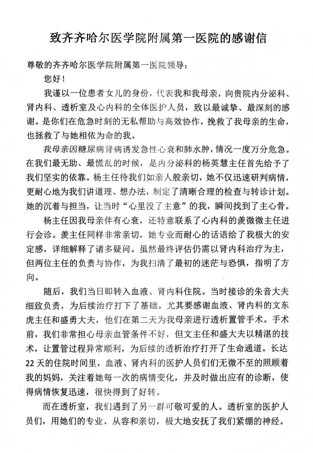 锦旗熠熠,书信暖心,这不仅是患者家属的真情流露,更是对我院医疗服务质量的最高褒奖。未来,我院全体医护人员将继续秉持“敬佑生命、救死扶伤”的初心,用精湛医术与人文关怀守护百姓健康。