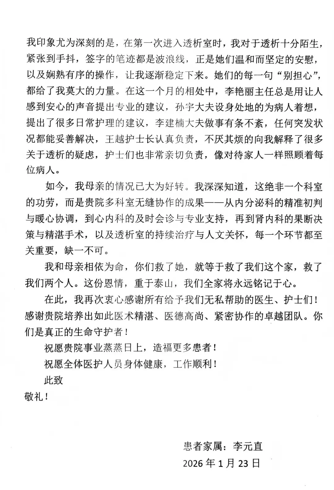 “你们救了我母亲,就等于救了我们这个家。”家属在感谢信中写道,字里行间满是对医护人员的信赖与感激。这份认可不仅是对血液肾内科团队的肯定,更是对医院多学科协作模式的高度赞誉。